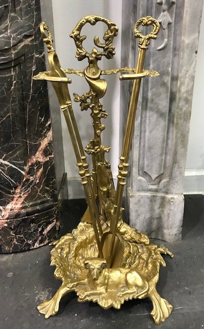 Louis XV style bronze fireplace set and accessories on the theme of hunting